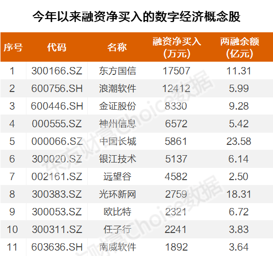 东方财富Choice数据还显示,嗅觉灵敏的杠杆资金今年以来融资净买入11只数字经济概念股。